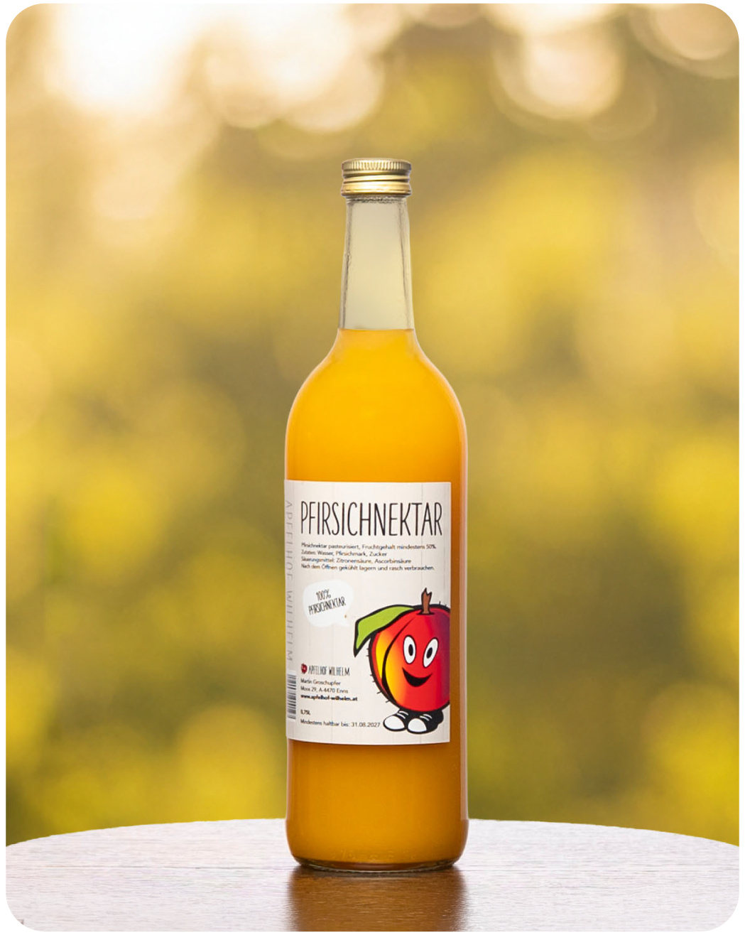 Angenehm fruchtiger Pfirsichnektar mit mindestens 50 % Fruchtgehalt. Weich, leicht süß und sanft im Geschmack – ideal gekühlt bei etwa 8 °C genießen.